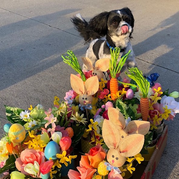 Yesterday we were taking pictures of our spring/ Easter arrangements, when we started to clean up and our dog was sitting in front of the arrangements. So we had a few pictures of him, but as my mom called him and he ran off we caught the funniest picture of him by the arrangements.